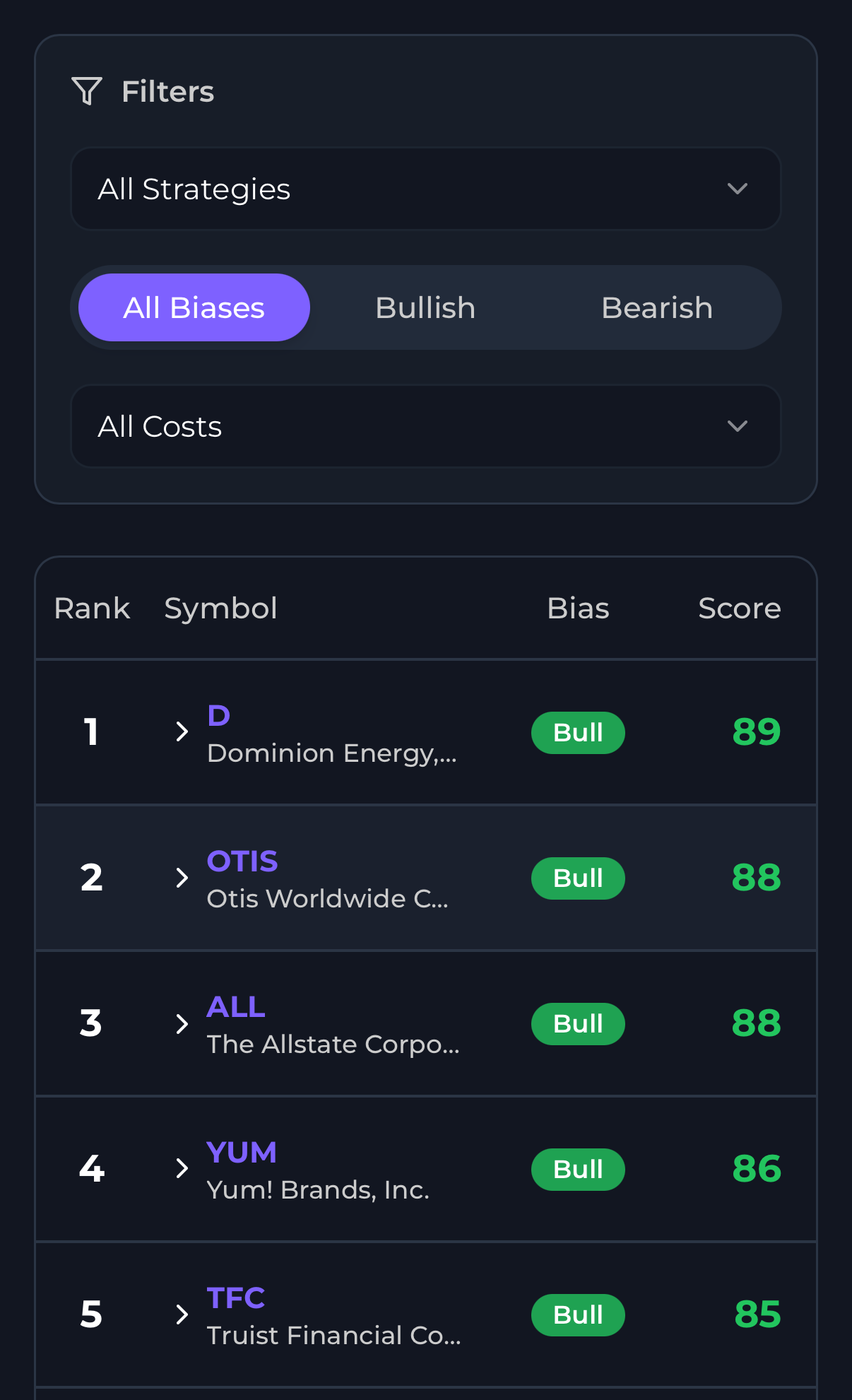Filter by bias, strategy, and cost to instantly find trades that match your style